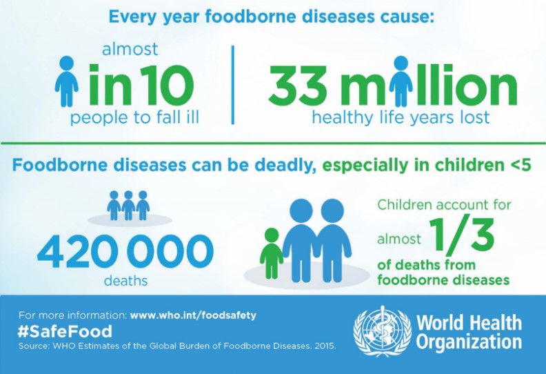 According to the World Health Organisation (WHO), food insecurity causes 600 million food cases and 420,000 deaths annually. Thirty percent of deaths related to foodborne diseases occur among children under 5 years of age. WHO estimates that 33 million years of healthy individuals are lost due to the global consumption of unsafe foods each year, and this number is probably an underestimate.